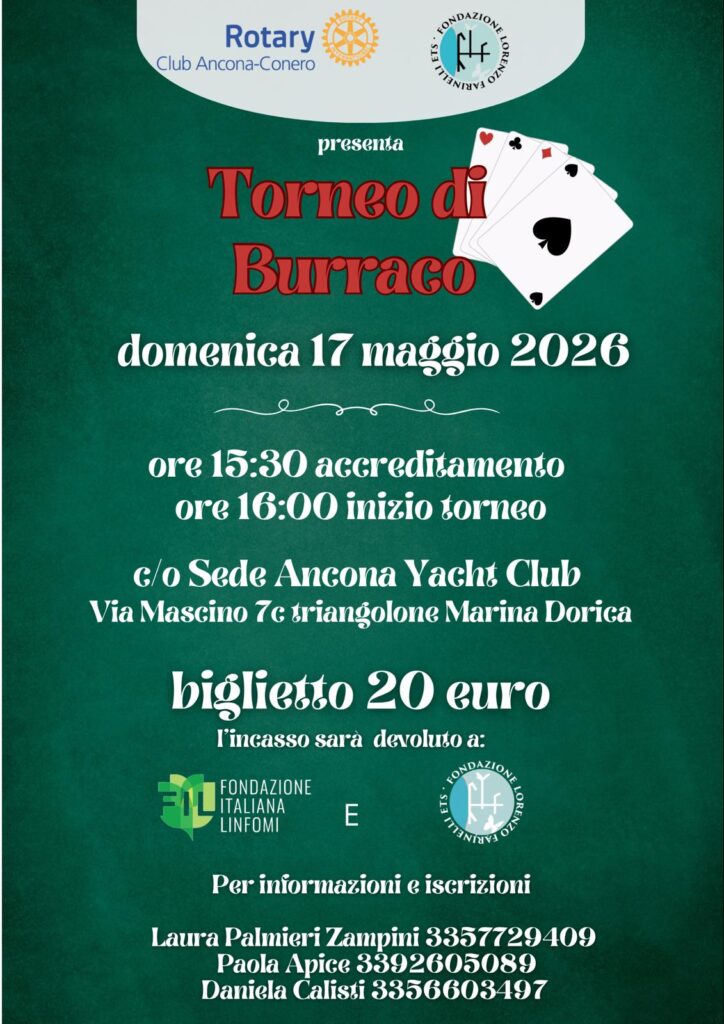 Il Rotary Club Ancona Conero organizza il Torneo di Burraco, che si terrà domenica 17 maggio 2026 presso la sede dell’Ancona Yacht Club.